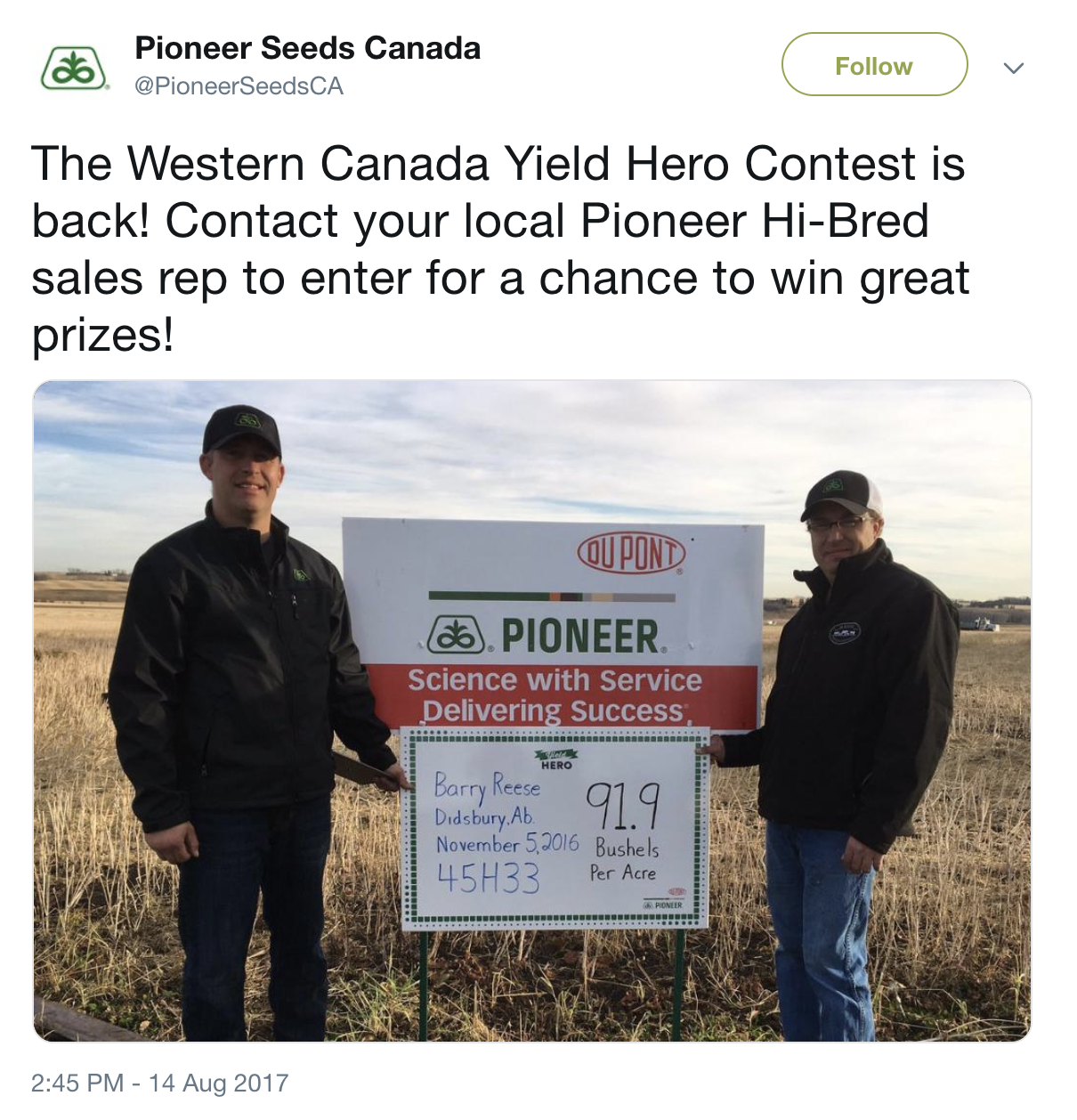 The Pioneer Yield Hero Contest. Provide a forum for growers to demonstrate their pride in Pioneer seed products by hosting a yield competition in each of the three crops in which Pioneer dominates. Growers compete for a grand prize by planting Pioneer seed then submitting their yield results through their rep, who photographs the grower holding their results “board” to proudly share on social media.